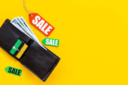 Discount shopping day - sale tag and wallet with banknotes and bank cards