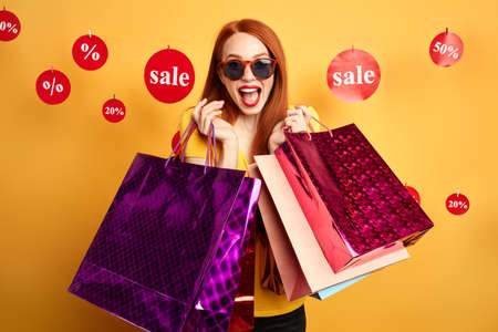 Happy man showing shopping bags and Up To 50 percent Off inscription note, smiling, celebrating, rejoicing good discounts, low prices for online sales. Yellow background. 6k downscaled, slow motion