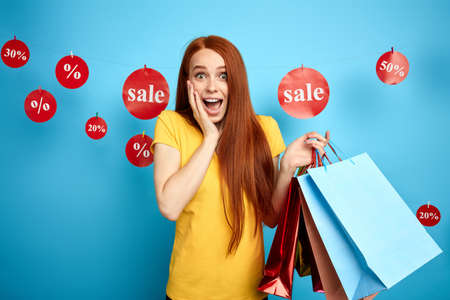 Shopping time. Amazing caucasian young woman stands on isolated pink background holds paper shopping bags and money, and looks at the camera