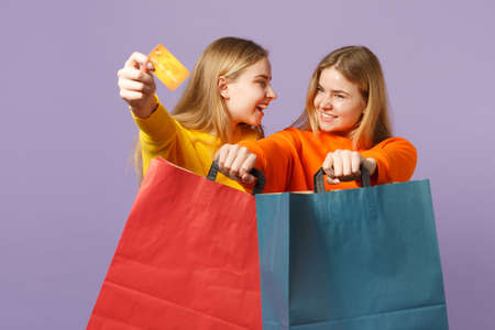 Two joyful blonde twins sisters girls in vivid clothes holding credit bank card package bag with purchases after shopping isolated on violet blue background. People family concept. Mock up copy space
