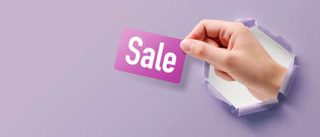 Customer hand breaking through a torn paper hole and holding a promotional sale card, blank copy space
