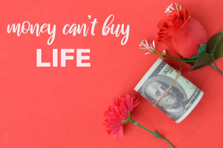 Top view of flowers and money banknote over red background with quote MONEY CAN'T BUY LIFE