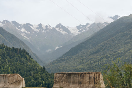 beautiful wooded rocky cliff against the backdrop of a mountain landscape