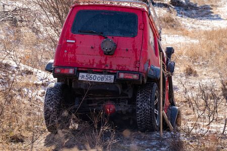 Truck on hill with view to great snow mountain range in sunlight. Sunset landscape with truck on background of snowy mountains in sunshine under blue sky. Russia, Altai Republic, 20 September, 2020.
