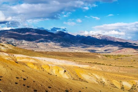 Landscape with red and yellow mountains. Mountains called Mars in Altai. Brown earth