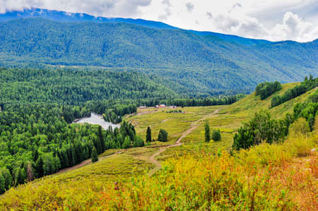 The village in Altai mountains, Russia. Aerial view landscape.