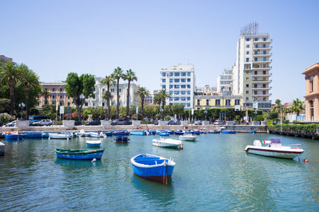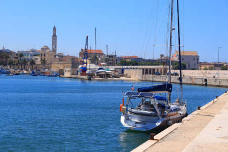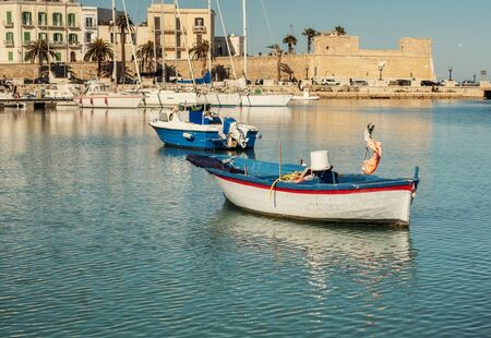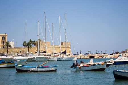 BARI, ITALY - JULY 11,2018, Boats in the port in the center of Bari, the embankment of the Emperor Hadrian in the part of the city called Bari Vecchia
