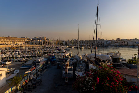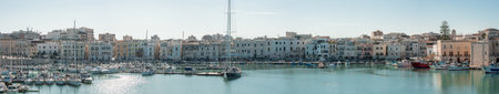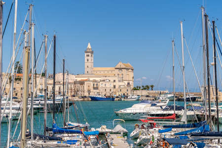 Trani, Puglia, Italy, June 2021: View of a nice fishing harbor and marina in Trani, with San Nicola Pellegrino Cathedral of Trani, Puglia region, Italy
