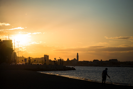 Panoramic view of cityscape in Bari, Italy. Romantic, calm, relaxing evening at the beach or city. Silhouette of cityscape. Sun is setting over old town.