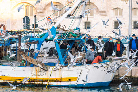 Molfetta, Bari, Italy - January 4 2022: Old fishing boat parked near the quay of the port selling fresh just caught raw fish to the people