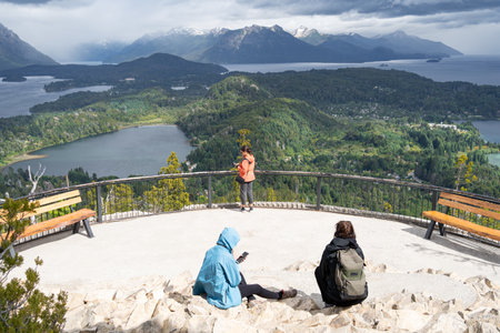 San Carlos de Bariloche Rio Negro Argentina - December 02, 2022: Three young ladies are at the viewpoint of Cerro Campanario watching the beautiful landscape of Bariloche Argentina