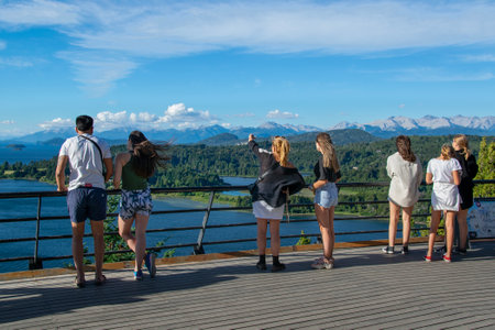 San Calors de Bariloche, Argentina; January 5 2023: People watching the view at circuito chico panoramic point, in san carlos de bariloche city, rio negro province, patagonia, argentina