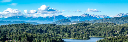 View of beautiful landscape of snowy mountains and green trees from Cerro Campanario (Campanario Hill) in San Carlos de Bariloche, Rio Negro, Patagonia Argentina.