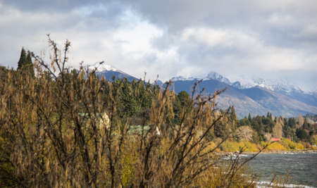 Rich greenery surrounding river in Bariloche, city in province of Rio Negro in Argentina.