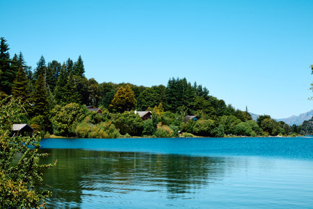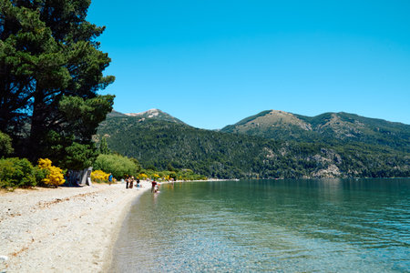 Sunny summer day landscape at one of the beaches of bariloche, nahuel huapi national park, rio negro province, argentina.