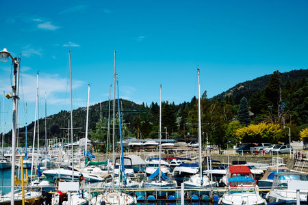 yachts parked with high masts off the coast of rocky mountains overgrown with greenery, Bariloche National Park