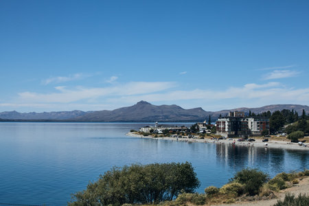 A magnificent lake in Patagonia surrounded by mountains. Hiking and ecotourism concept. Sunny autumn day. The beach line runs along the lake