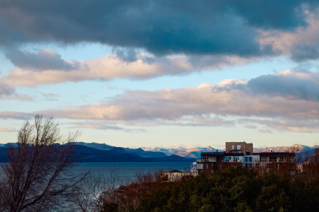 San Carlos de Bariloche, Argentina; January 4 2023: Sunset time landscape at waterfront skatepark, san carlos de bariloche, rio negro province, patagonia, argentina