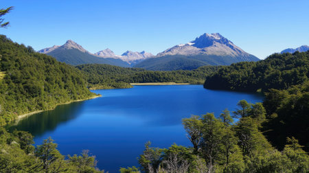 Landscape of blue lakes, Andes mountains, and forest in Patagonia, Argentina
