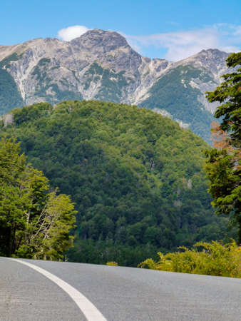 Characteristic landscape of the Andes mountain range in Argentine or Chilean Patagonia. There is a beautiful lake, a forest, great mountains and a dirt road.