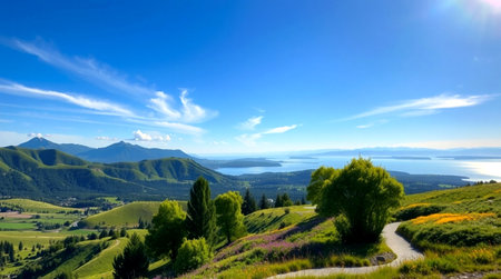 A mesmerizing mountain landscape featuring a tranquil lake alongside a winding road, perfect for outdoor adventures and exploration. Ideal for travel themes.