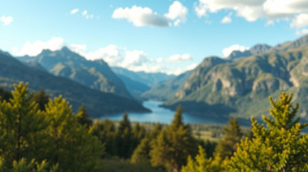 Blurred view of lake and mountains in summer. Beautiful nature background.