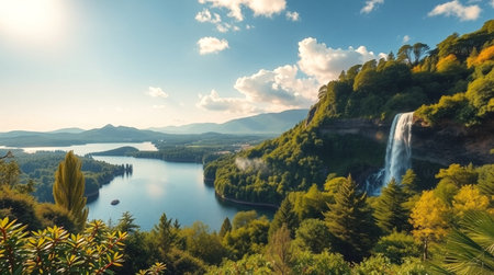 Discover a breathtaking view of a serene lake surrounded by majestic mountains and vibrant greenery. This picturesque landscape offers tranquility and natural beauty.