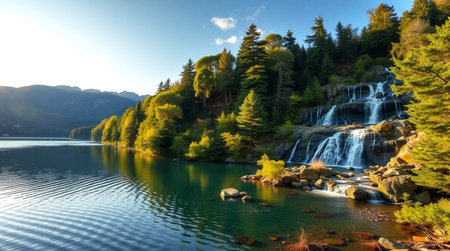 A tranquil lake reflecting snow-capped mountains, surrounded by lush green forests.