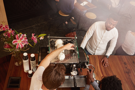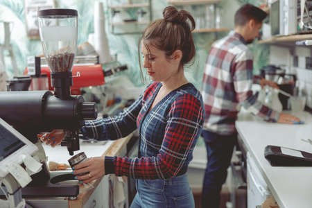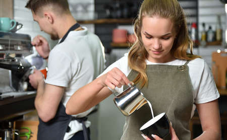 Barista man and woman making coffee, couple of young people working in coffee shop.