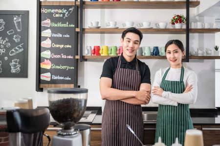 Portrait of couple young barista wearing apron standing smiling with looking at camera in coffee shop. Asian man and woman standing arm crossed with welcome and waiting to take customer order in cafe.