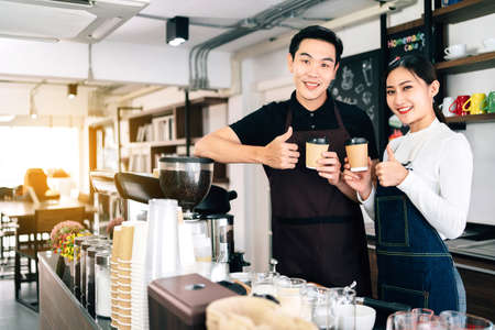 Portrait of couple barista working and standing behind the counter bar in a cafe