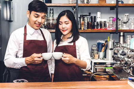 Smiling Caucasian Young barista couple love or partnership is wearing apron and happy for working in the coffee shop. Start up for small cafe business owner concept.