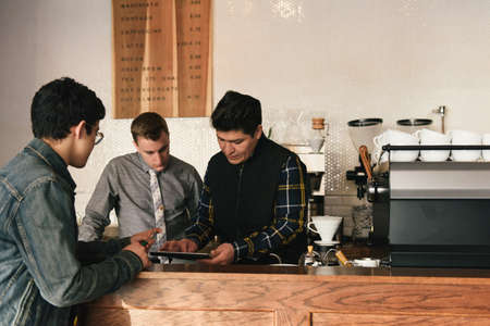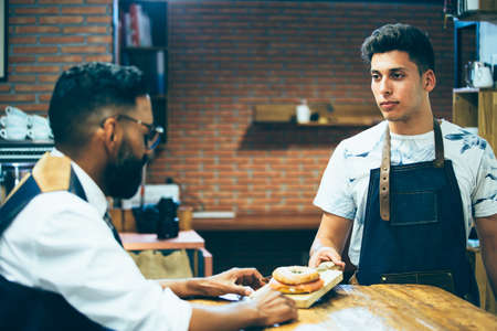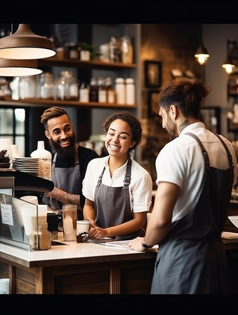 Another customer. Happy to see him. Two young cafe workers indoors. Conception of business and service.