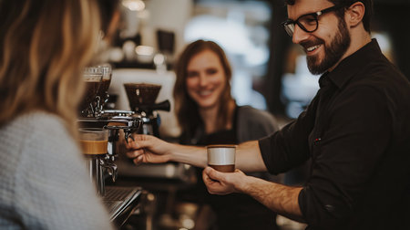 A cheerful barista hands a cup of freshly made coffee to a customer in a cozy caf