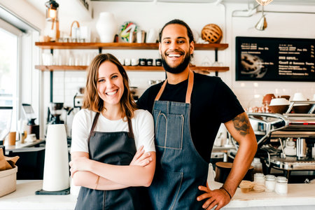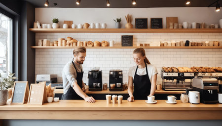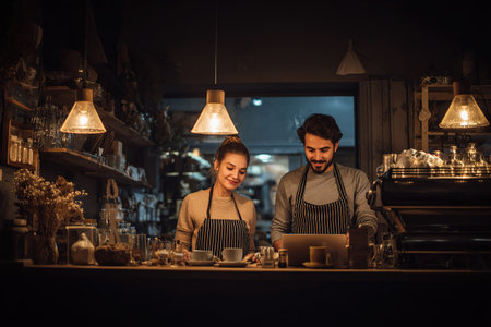 Small business owners working together at cafe counter, cozy setting with warm lighting.