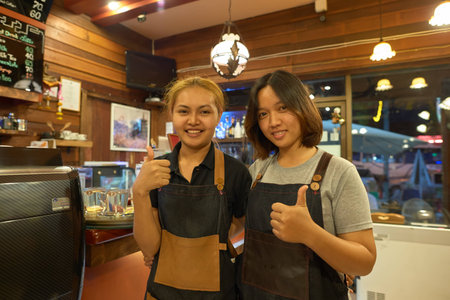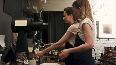 Two asian coffee waitress making cup of hot coffee latte in coffee shop cafe. Barista working with coffee machine in shop.