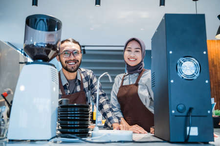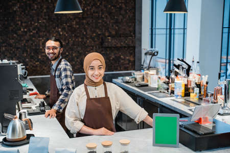 muslim waitress or owner and partner portrait smiling to camera at the coffee shop
