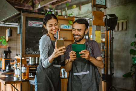 male barista holding the deposit book while looking at the phone that holded by the female barista