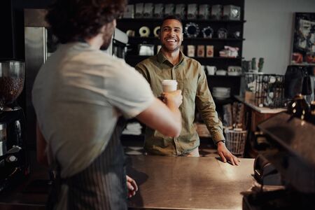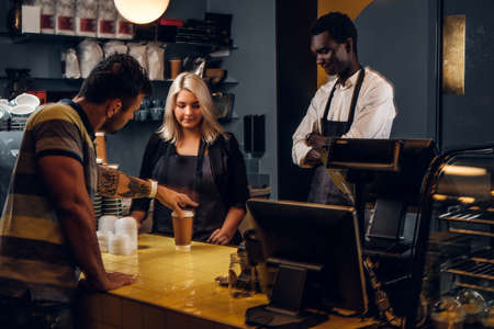 Cheerful customer buying takeaway coffee from modern cafe house standing across counter
