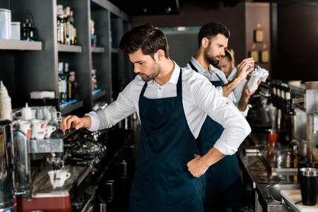 Barista using a coffee maker to coffee,Cafe worker making a coffee,Cafe owner in apron making coffee.