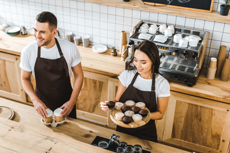 attractive cashier with cupcakes and handsome barista with paper cups standing behind bar counter in coffee house