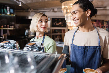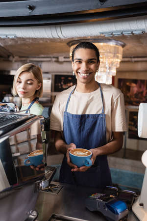Smiling african american barista holding coffee near colleague and coffee machine in cafe