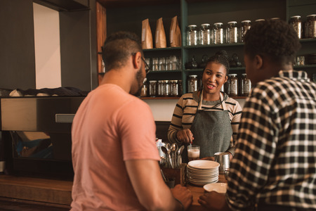 Customers select coffee items. with a young woman barista working at the coffee shop counter