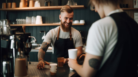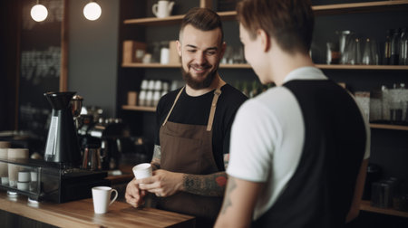 Barista in apron serving coffee to customer at counter in cafe ai generated.“This image was created using generative artificial intelligence tools