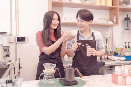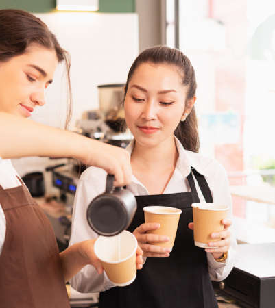 Young asian barista with a smile pouring milk from the jug into a paper coffee cup. Caucasian assistant in an apron stand watching beside her. Morning atmosphere in a coffee shop.