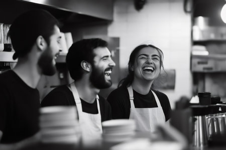 Three baristas wearing aprons are laughing together behind the counter of their coffee shop