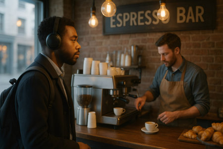 Young businessman wearing headphones waiting for his coffee at the counter of an espresso bar, while the barista prepares it