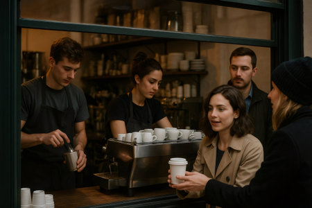Baristas working diligently at the counter, preparing and serving steaming cups of coffee to customers in a bustling urban cafe