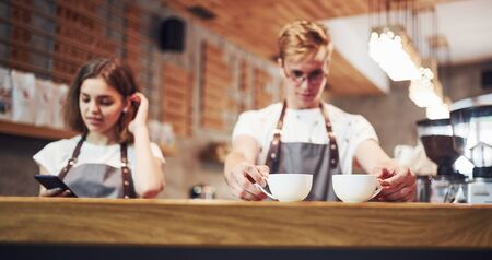 A young guy and a barista girl work in a coffee shop and make coffee. Concept staff and teamwork