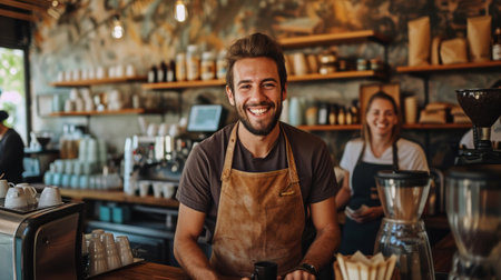 In a cozy cafe, a barista with a smile prepares to serve coffee to a customer, creating a friendly atmosphere filled with warmth and delight.